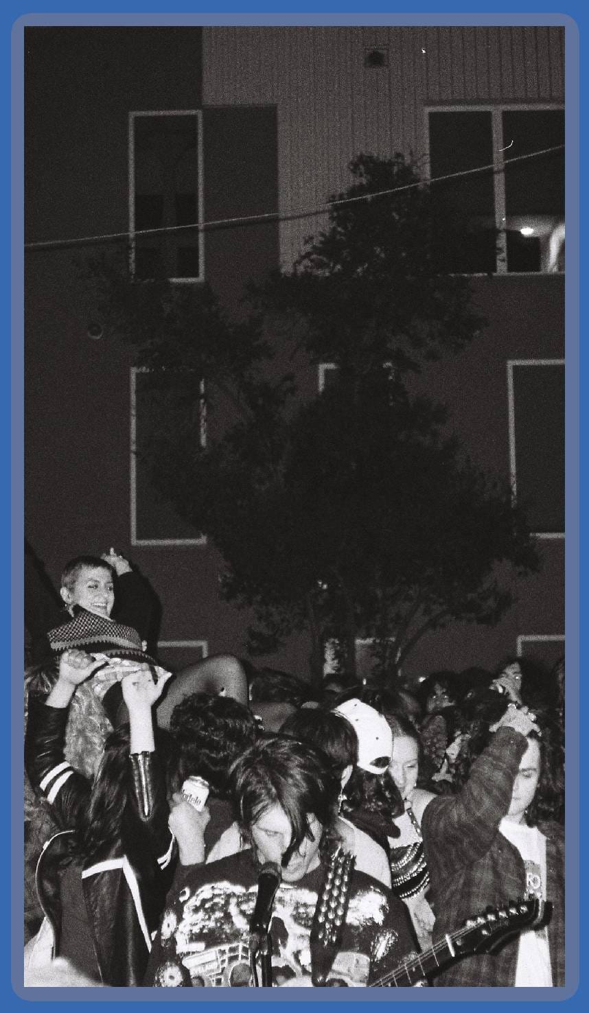 Feeble Little Horse played a secret basement show in Pittsburgh last weekend. The hometown indie-gaze visionaries are way too big to be playing basement shows these days, so the actual address of the house was left off the flier and fans had to show up to a different spot around the corner and then "follow the bugs" to the real destination. The bugs were cutout posters of the beetle on Feeble's recent single, "This Is Real." My friends and I showed up to the house a half hour before doors and there was already a gaggle of college kids lounging on the front lawn. One had a Car Seat Headrest tattoo and another was openly ripping a bong on the sidewalk. By the time 7:30 rolled around, the line down the block was long enough to make a restaurant host consider quitting on the spot. As we filtered into the unusually large basement space, my friends and I (the only millennials in the room 😔) scampered to the front and secured a prime view of the action – a location that would prove difficult to maintain as the evening went on.