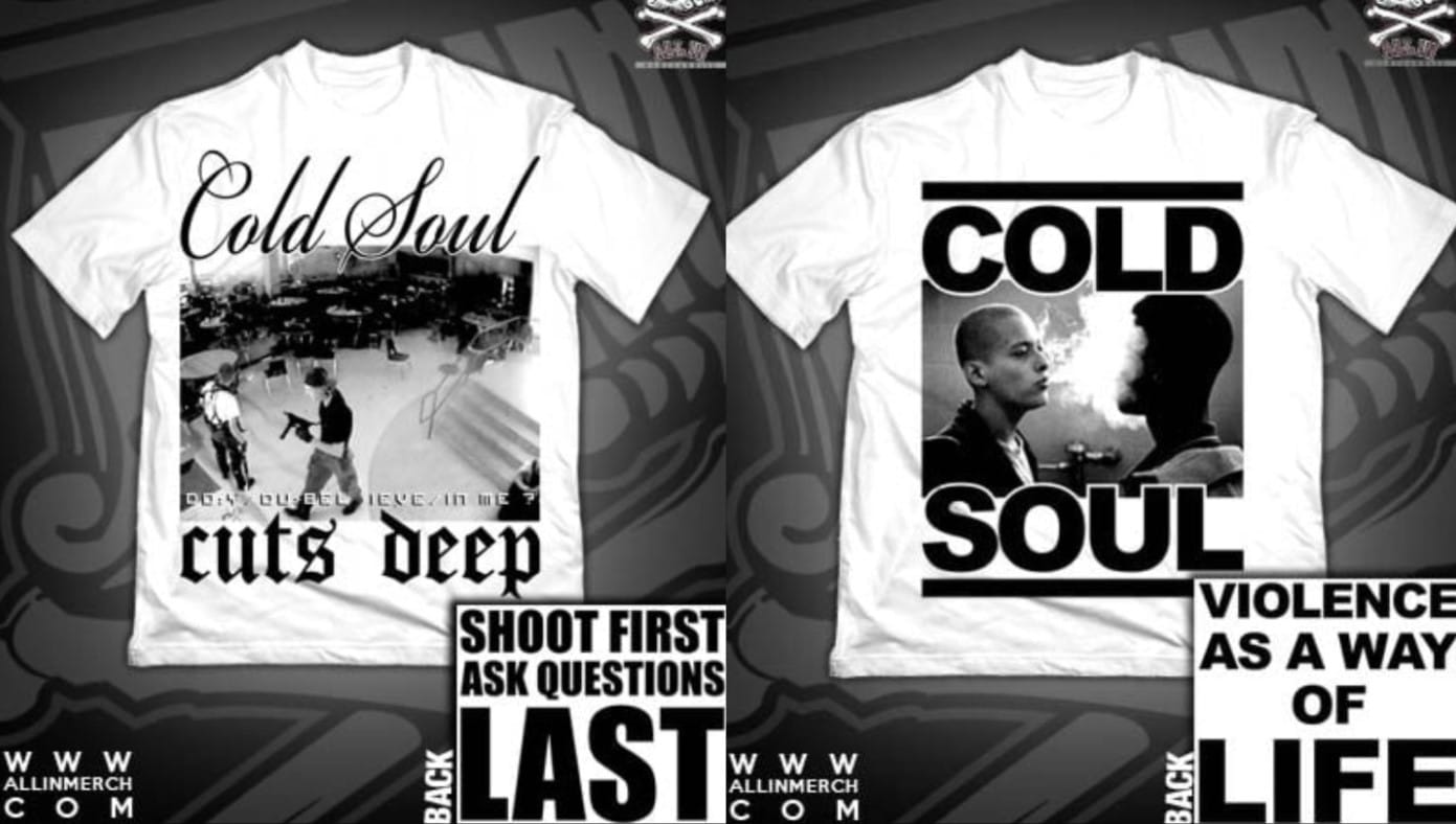 In 2012, Palmeri posted pre-orders for a new t-shirt company he was launching called Cold Soul. One shirt featured infamous camera footage of Columbine school shooters Eric Harris and Dylan Klebold with the text "shoot first ask questions last." Another contained the brand's name over a screenshot from American History X where Edward Furlong's Nazi character blows cigarette smoke in a Black boy's face. The back text read, "violence as a way of life."