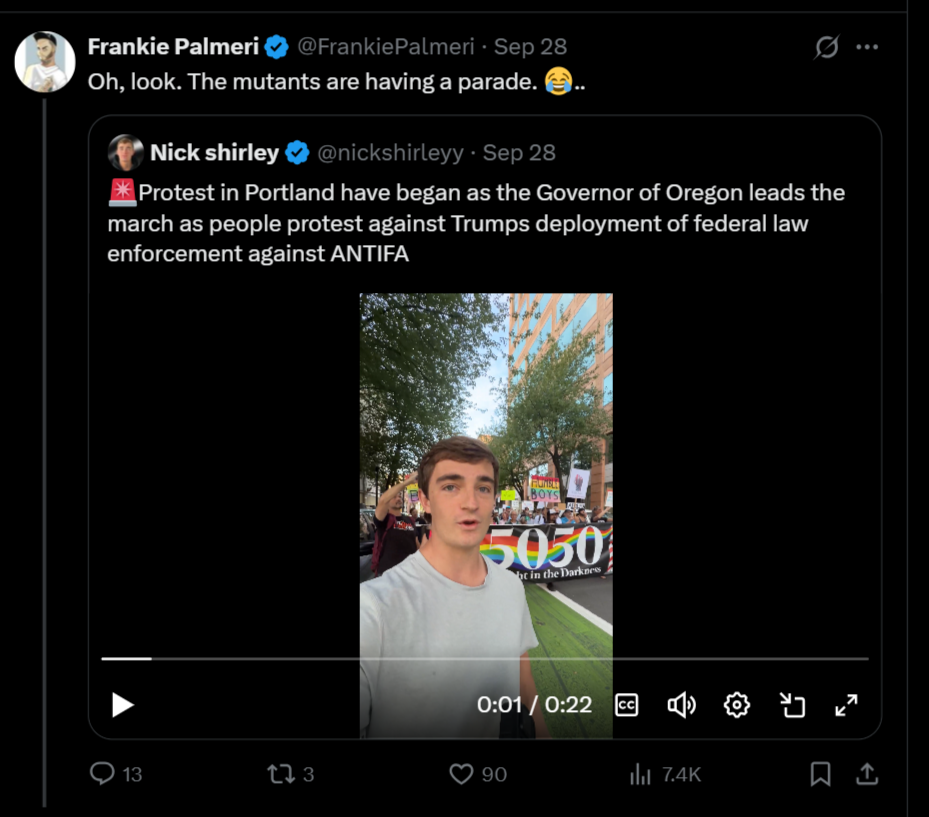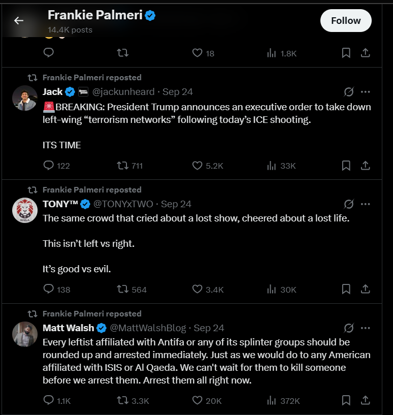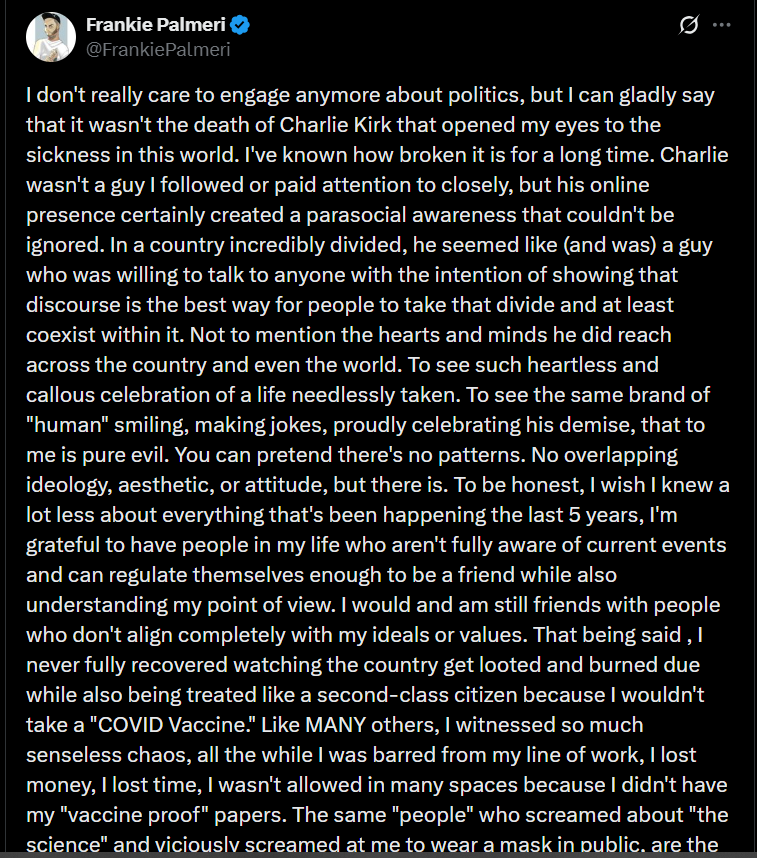 Then, like so many right-wingers who've opportunistically used Kirk's murder to whitewash his explicitly hateful legacy and cast themselves as moralistic superiors, Palmeri undermined his phony commitment to principled non-violence by aligning himself with Kirk's fascist vindicators. He retweeted a bunch of America-first Nazis who frame the country's political divide as a battle of "good vs. evil" and equate Antifa with Al-Qaeda. He doubled down on an older tweet revealing he "truly don't give a fuck about the Gaza situation." He retweeted another ethno-nationalist account promoting the opposition of "reckless third world migration." A few days later, Palmeri himself posted that anti-fascist protestors are "dysgenic freaks with no purpose. Just put them in the fucking ground."